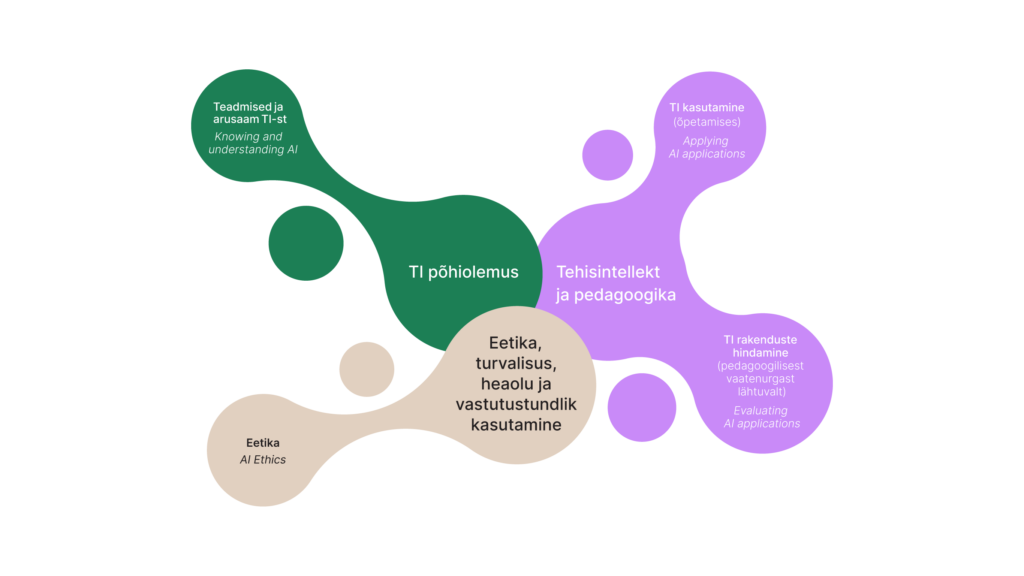 2) tehisintellekt ja pedagoogika, mis omakorda jaotuvad: TI rakendamine õpetaja töös (väljaspool klassiruumi ja TI rakendamine õppetöös); ning TI vahendite hindamine pedagoogilisest perspektiivist;